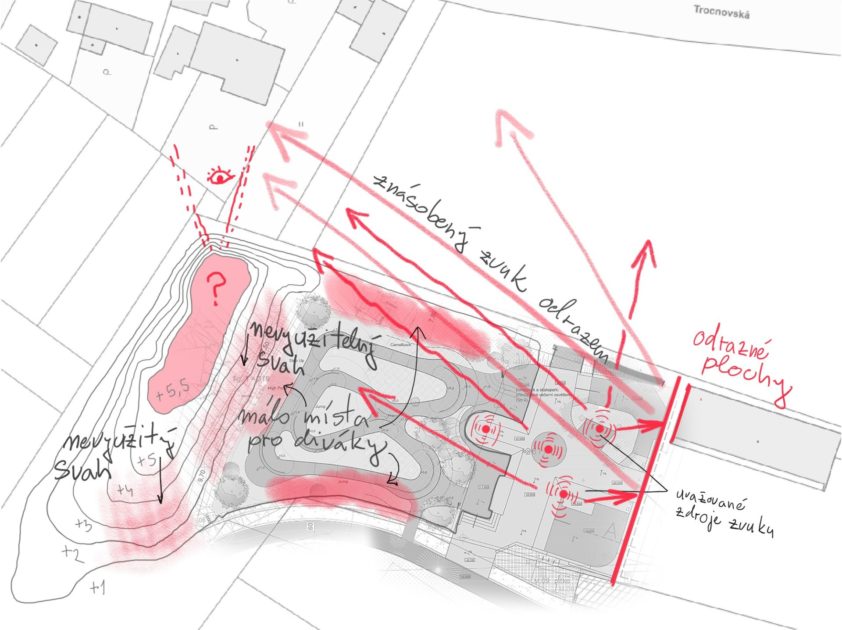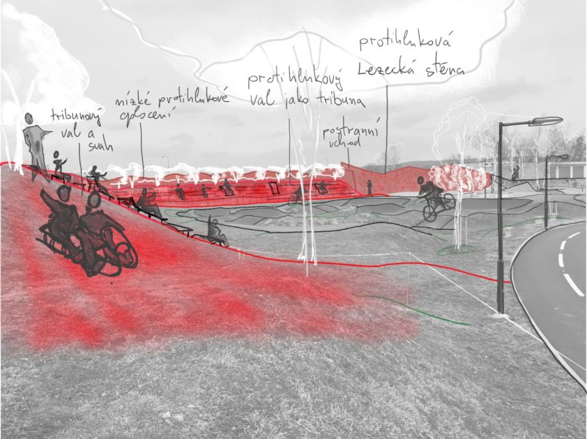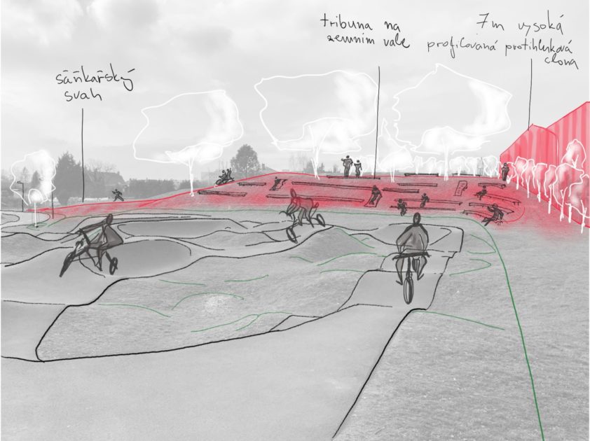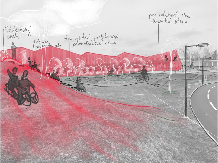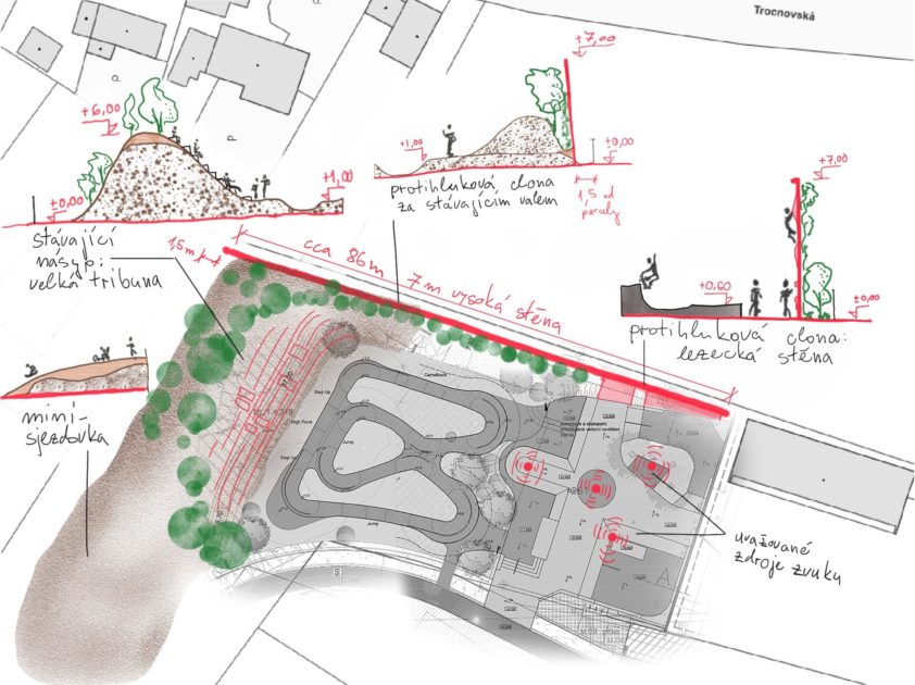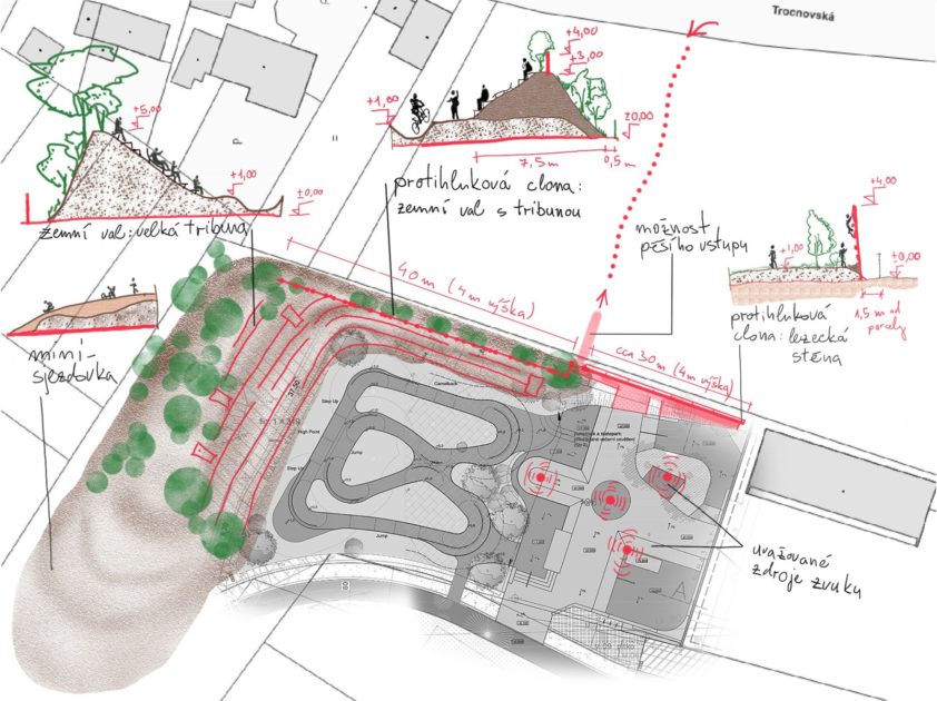 Skica řešení problému s nadměrných hlukem skateparku a smysluplné využití navezeného terénu v parku moderních sportů