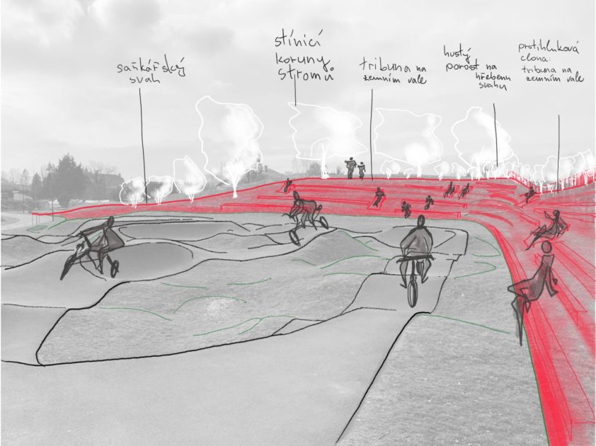 Stávající navážka je pouze přesypaná tak, aby poskytla svah vhodný pro terénní tribunu (viz obrázky inspirace níže), která poskytné sezení i případné ležení. V jížní části bude zastíněna novými stromy s rozložitou korunou. Na jihu úpravy vyhladí sklon a prodlouží svah pro využití jako zimní minisjezdovka. V rovinatém terénu města se určitě uplatní. Celkově je tribuna nejenom valem bránícím šíření zvuku, ale také vizuálním uzávěrem prostoru, který umocňuje sportovní a soutěžívou atmosféru prostředí.