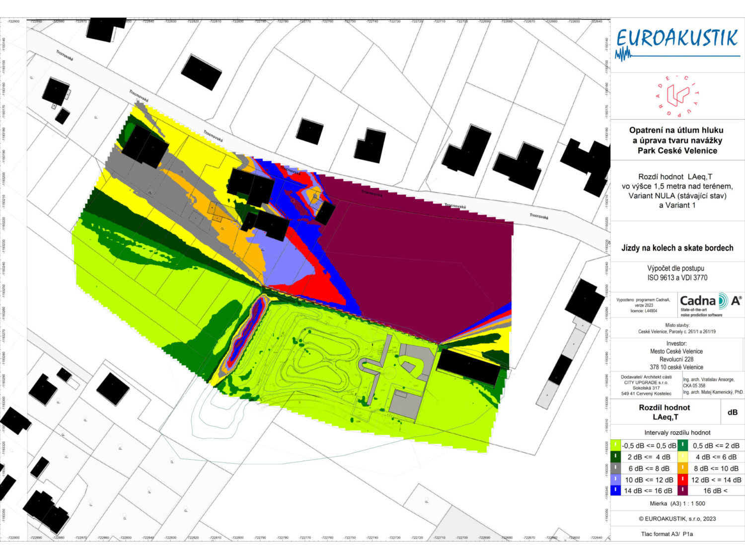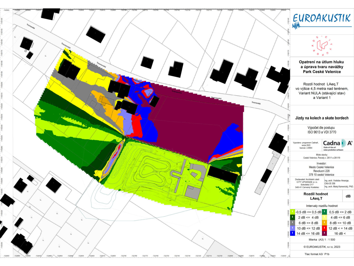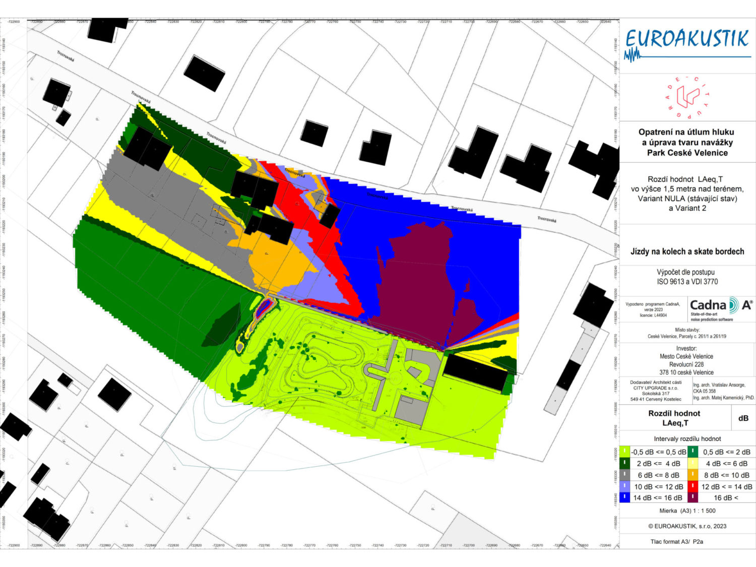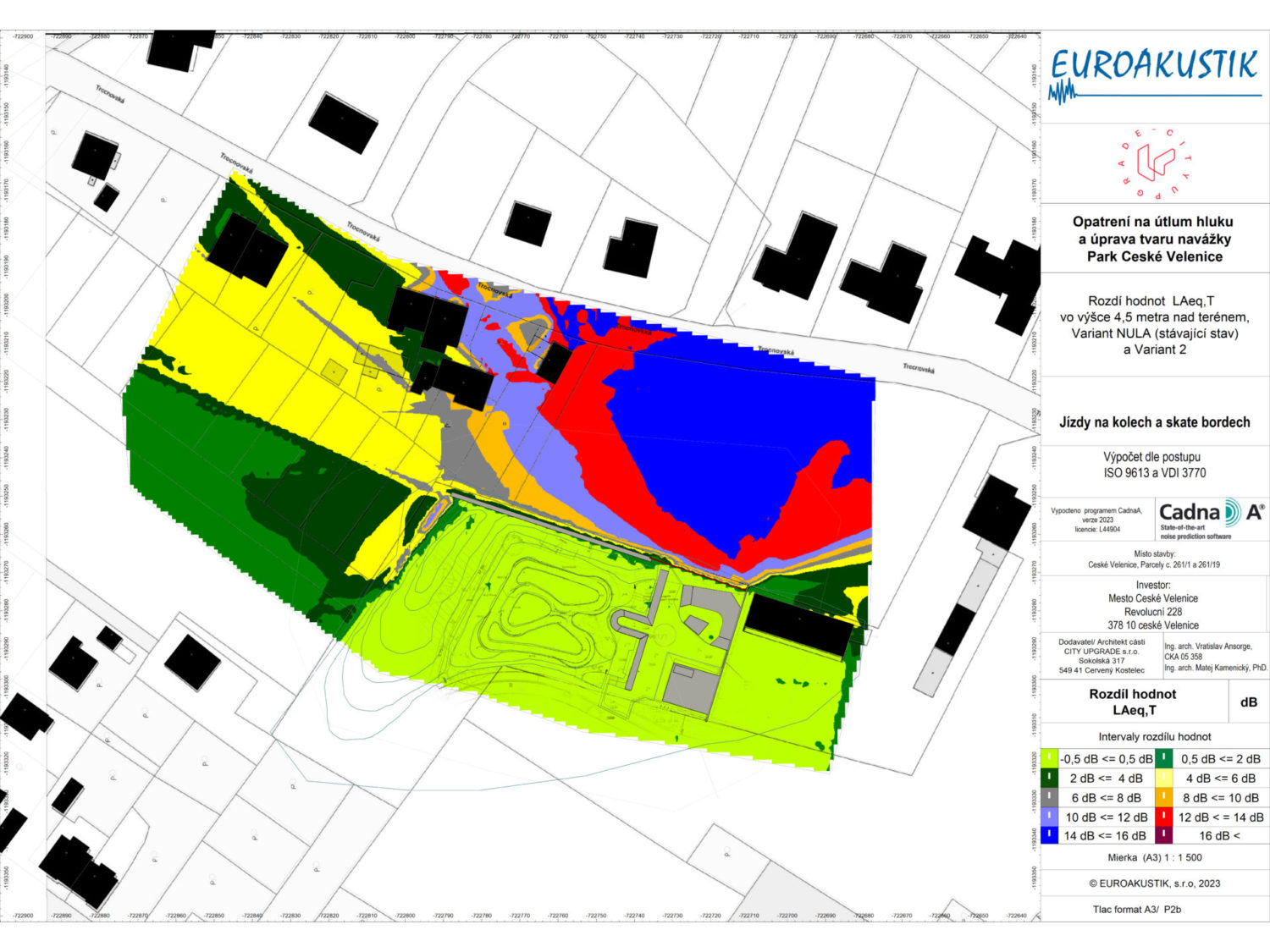 Akustická studie k této variante ukazuje relativní změnu množství akustické energie ve dvouch výškových úrovních – přízemí( 1,5m) a v patře (4,5m).  Orientačně lze říct, že rozdíl 10-12 dB představuje až 3 násobné snížení vnímaného hluku. Jsou posuzeny pouze zdroje ze skateparku.